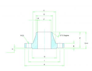 | Size (Inch) | Size (mm) | OD (A) | Thick (B) | Hub OD (C) | Neck OD (D) | Length (E) | RF Dia (G) | PCD (I) | RF Ht (H) |